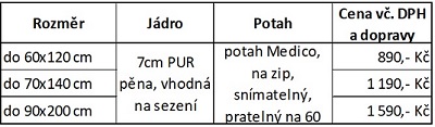 Jádro matrace tvoří 7cm PUR pěna s vyšší hustotou, která je vhodná na sezení. Potah Medico je v bílém provedení, na zip, snímatelný a pratelný. Matraci vám vyrobíme v libovolném rozměru (v centimetrových krocích) za ceny uvedené v tabulce níže (ceny již zahrnují dopravu po ČR). Pro objednání stačí jen upřesnit rozměr, dodací adresu a telefonní číslo na email info@sestavtesimatraci.cz. Zboží vám zašleme na dobírku do 5 pracovních dní.